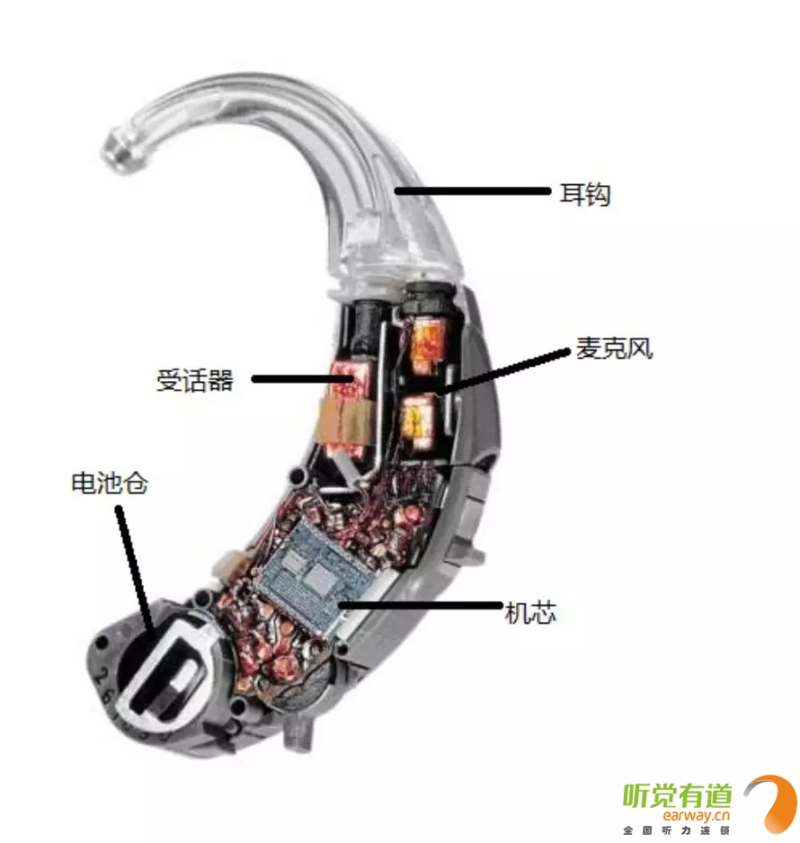<span style="font-size:16px;"> 在助聽器發(fā)展過程中,出現(xiàn)過很多種助聽器,比如:盒式、眼鏡式、耳背式、耳甲腔式、耳道式、深耳道式等定制式助聽器。如今盒式助聽器、眼鏡式助聽器等幾乎已退出歷史舞臺,現(xiàn)在常見的助聽器有耳背式助聽器、定制式助聽器和RIE受話器外置式助聽器。</span></p><p style="text-align: center;"><span style="font-size:16px;"><img src="/upfiles/201808160127045435.jpg" width="640" alt="" /><br /></span></p><p><span style="font-size:16px;"> 接下來,我們將以耳背式助聽器為例,向您介紹助聽器的外部配件及內(nèi)部構(gòu)造!</span></p><p><span style="font-size:16px;"> 1、機身內(nèi)部構(gòu)造</span></p><p style="text-align: center;"><span style="font-size:16px;"><img src="/upfiles/201808160127276133.jpg" width="640" alt="" /><br /></span></p><p><span style="font-size:16px;"> 麥克風(fēng):獲取聲音并將聲音信號轉(zhuǎn)化為電信號。</span></p><p><span style="font-size:16px;"> 機芯:將電信號進行放大、處理,機芯包含放大器、音量調(diào)控電位器、微調(diào)電位器等。</span></p><p><span style="font-size:16px;"> 受話器:將電信號轉(zhuǎn)化為聲音信號,通過導(dǎo)聲管和耳模傳送給耳朵。耳背式助聽器和定制式助聽器的受話器都在機身內(nèi);RIE受話器外置式助聽器的受話器放置在耳道中。</span></p><p><span style="font-size:16px;"> 電池倉:用于安放電池來供電,使助聽器正常工作。</span></p><p><span style="font-size:16px;"> 2、電池</span></p><p><span style="font-size:16px;"> 電池放置于電池倉內(nèi),給予助聽器能量。市面上常見的助聽器電池分為4類:</span></p><p><span style="font-size:16px;"> A675:一般用于超大功率耳背式助聽器。</span></p><p><span style="font-size:16px;"> A13:一般用于標準耳背式或耳甲腔式助聽器。</span></p><p><span style="font-size:16px;"> A312:一般用于耳道式助聽器。</span></p><p><span style="font-size:16px;"> A10:一般用于深耳道式助聽器。</span></p><p><span style="font-size:16px;"> 電池大小:A675>A13>A312>A10,電池越大,儲存能量越多。</span></p><p><span style="font-size:16px;"></span></p><p> 更多詳情請登錄m.caosairsoft.com。</p>" />