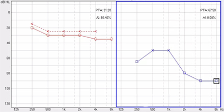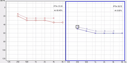 <span style="font-size:16px;"> 純音聽閾測試是聽力學所有測試項目中最基本的一項內容,包括氣導(AC)、骨導(BC)、最舒適閾(MCL)與不舒適閾(UCL)測試。測試結果能夠直接反映患者雙耳的聽力損失程度、性質與動態范圍,還能夠間接反映患者的患病位置、病因與助聽后效果。</span></p><p><span style="font-size:16px;"> 一般地,整個檢查控制在10分鐘左右,既能全面做完檢查,又不至患者疲憊而影響主觀反應。</span></p><p><span style="font-size:16px;"> 純音聽閾測試是最考驗聽力學工作者實際工作能力的一項基本內容:</span></p><p><span style="font-size:16px;"> 1、若患者曾長期暴露于噪聲中,且無其它致聾因素,很可能在3 kHz或6 kHz出現明顯的下降,聽力曲線呈現“V”字形,所以除了常規的倍頻程頻率外,還要加測這兩個頻率,否則就犧牲了多通道助聽器的意義;</span></p><p><span style="font-size:16px;"> 除了有過噪聲接觸史的患者需要加測半倍頻程外,涉及聲場助聽聽閾評估、賠償等情況都需要加測半倍頻程。</span></p><p><span style="font-size:16px;"> 耳鳴困擾的患者,注意避免與耳鳴聲類似的純音,若還用純音作為刺激聲,患者就會分辨不清,出現假陽性或假陰性。所以,測試者要換成囀音,既有別于耳鳴聲,又具有頻率特異性。</span></p><p><span style="font-size:16px;"> 2、不舒適閾反映患者對大聲的忍耐力,不舒適閾與氣導的差值能顯示患者的動態范圍,指導驗配師調節助聽器的最大輸出。</span></p><p><span style="font-size:16px;"> 不舒適閾測試頻率是否越多越好呢?非也。測得頻率過多,一會引起患者疲勞或不適,二是沒必要,大多數助聽器的最大輸出是一個整體,不能像調增益和壓縮那樣分通道,所以測多了并無好處,一般測0.5、1、2、4 kHz。</span></p><p><span style="font-size:16px;"> 3、如果兩側聽力有明顯差異,此時就要準備好掩蔽了,分為氣導掩蔽與骨導掩蔽。</span></p><p><span style="font-size:16px;"> (1)氣導掩蔽的判斷有兩個原則,只要符合其中一個原則,就需要重新測差耳氣導。具體做法是:</span></p><p><span style="font-size:16px;"> 測試完雙耳氣導,若發現某一頻率差耳氣導閾值比好耳氣導閾值多40 dB以上就要懷疑有可能是好耳偷聽的,需要給好耳氣導加掩蔽聲;</span></p><p><span style="font-size:16px;"> 測試完雙耳氣導與好耳骨導,若發現某一頻率差耳氣導閾值比好耳骨導閾值多40 dB以上就要懷疑有可能是好耳偷聽的,需要給好耳氣導加掩蔽聲。</span></p><p><span style="font-size:16px;"> 下面為未掩蔽的聽力圖:</span></p><center><span style="font-size:16px;"><img alt="" src="/upfiles/201810160133207570.png" width="440" height="220" /></span></center><p></p><p><span style="font-size:16px;"> 下圖為掩蔽后的左耳真實氣導值:</span></p><center><span style="font-size:16px;"><img alt="" src="/upfiles/201810160133289538.png" width="440" height="220" /></span></center><p></p><p><span style="font-size:16px;"> (2)骨導掩蔽的判斷原則:</span></p><p><span style="font-size:16px;"> 測試完雙耳氣導與好耳骨導,若發現某一頻率差耳氣導閾值比好耳骨導閾值大于等于15 dB就必須予以掩蔽,重測骨導。下圖為右耳氣導加掩蔽后左耳骨導的真實值:</span></p><center><span style="font-size:16px;"><img alt="" src="/upfiles/201810160133368026.png" width="440" height="220" /></span></center><p></p><p><span style="font-size:16px;"> 注意:</span></p><p><span style="font-size:16px;"> 1)掩蔽的規則要按順序適用;</span></p><p><span style="font-size:16px;"> 2)各頻率根據規則決定是否需要加掩蔽;</span></p><p><span style="font-size:16px;"> 3)很少需要掩蔽所有頻率,通常氣導掩蔽頻率不應超三個,骨導掩蔽頻率不應超兩個,否則受試者會疲憊不堪。</span></p><p><span style="font-size:16px;"> 醫院測聽的主要目的是診斷和鑒別聽力損失的性質和程度,驗配中心的主要目的是盡可能地幫助患者選擇并調試好助聽器。</span></p><p><span style="font-size:16px;"> 更多詳情請登錄m.caosairsoft.com</span></p>" />