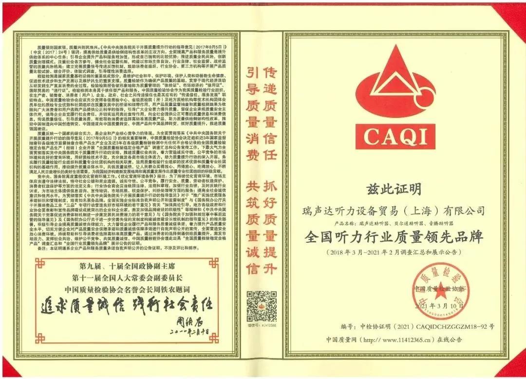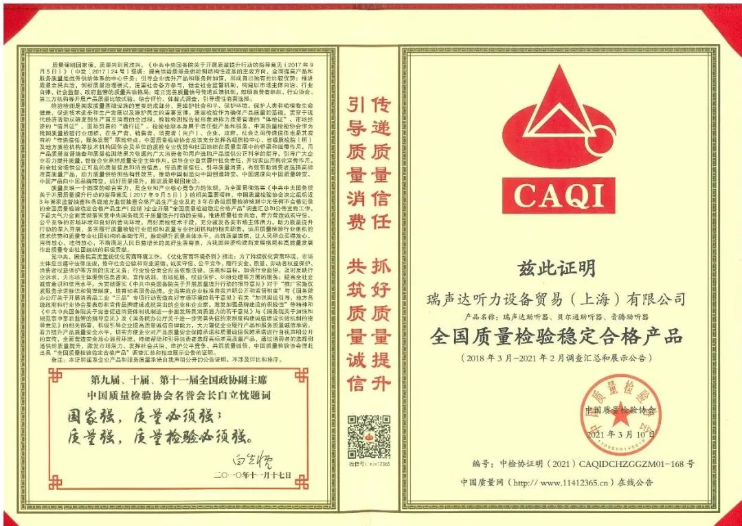 <span style="white-space:pre"> </span>質量是企業和產業核心競爭力的體現。<br /><br /> 作為對貝爾通助聽器產品質量和服務的肯定,2021年中國質量檢驗協會再次向貝爾通助聽器頒發了三項榮譽證書,以期能引導用戶選擇高標準高質量的產品,傳遞質量信任,優化消費環境。<br /><br /> 這三項榮譽包括“全國產品和服務質量誠信示范企業”“全國聽力行業質量領先品牌”“全國質量檢驗穩定合格產品”。<br /><br /> 除了貝爾通助聽器,瑞聲達和音騰助聽器亦同獲此譽。<br /><br /> CAQI<br /><br /> 全國產品和服務質量誠信示范企業<br /><br /> 全國聽力行業質量領先品牌<br /></span><p style="text-align: left;"><span style="font-size:16px;"> 全國質量檢驗穩定合格產品</span></p><p style="text-align: center;"><img src="/upfiles/202103160512466507.jpg" width="640" alt="" /> <img src="/upfiles/202103160512463998.jpg" width="640" alt="" /> <img src="/upfiles/202103160512465078.jpg" width="640" alt="" /><br /></p><p style="text-align: center;"><br /></p>" />